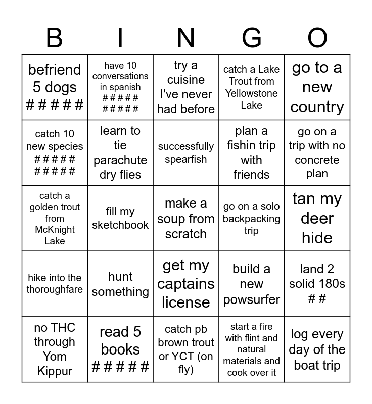 This bingo card has a free space and 24 words: hunt something, read 5 books # # # # #, successfully spearfish, no THC through Yom Kippur, go to a new country, befriend 5 dogs # # # # #, catch 10 new species # # # # # # # # # #, have 10 conversations in spanish # # # # # # # # # #, go on a solo backpacking trip, get my captains license, plan a fishin trip with friends, catch a golden trout from McKnight Lake, build a new powsurfer, land 2 solid 180s # #, learn to tie parachute dry flies, start a fire with flint and natural materials and cook over it, tan my deer hide, try a cuisine I've never had before, go on a trip with no concrete plan, fill my sketchbook, log every day of the boat trip, hike into the thoroughfare, catch a Lake Trout from Yellowstone Lake and catch pb brown trout or YCT (on fly).