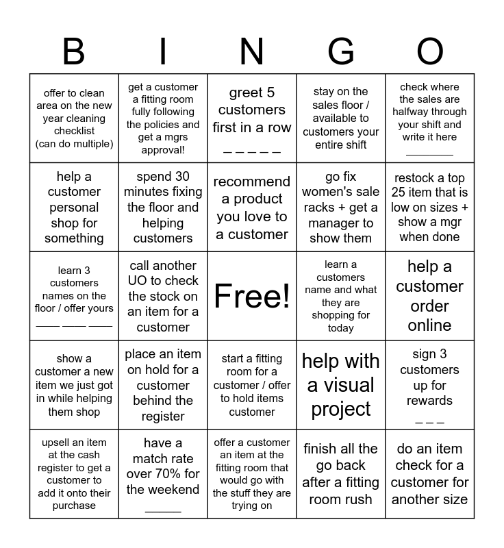 This bingo card has a free space and 24 words: place an item on hold for a customer behind the register, have a match rate over 70% for the weekend _____, recommend a product you love to a customer, upsell an item at the cash register to get a customer to add it onto their purchase, check where the sales are halfway through your shift and write it here ________, offer to clean area on the new year cleaning checklist (can do multiple), help a customer personal shop for something, get a customer a fitting room fully following the policies and get a mgrs approval!, learn a customers name and what they are shopping for today, start a fitting room for a customer / offer to hold items customer, go fix women's sale racks + get a manager to show them, learn 3 customers names on the floor / offer yours ____ ____ ____, help with a visual project, sign 3 customers up for rewards _ _ _, spend 30 minutes fixing the floor and helping customers, finish all the go back after a fitting room rush, help a customer order online, greet 5 customers first in a row _ _ _ _ _, restock a top 25 item that is low on sizes + show a mgr when done, call another UO to check the stock on an item for a customer, do an item check for a customer for another size, show a customer a new item we just got in while helping them shop, stay on the sales floor / available to customers your entire shift and offer a customer an item at the fitting room that would go with the stuff they are trying on.