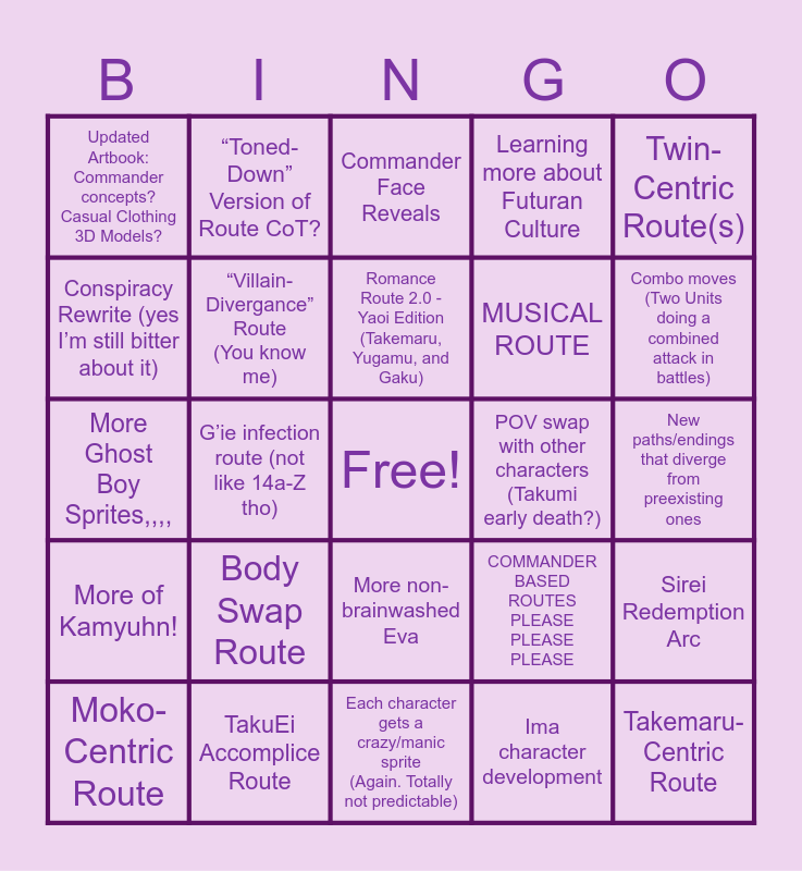 This bingo card has a free space and 24 words: Body Swap Route, TakuEi Accomplice Route, Romance Route 2.0 - Yaoi Edition (Takemaru, Yugamu, and Gaku), Moko-Centric Route, Twin-Centric Route(s), Updated Artbook: Commander concepts? Casual Clothing 3D Models?, Conspiracy Rewrite (yes I’m still bitter about it), “Toned-Down” Version of Route CoT?, POV swap with other characters (Takumi early death?), More non-brainwashed Eva, MUSICAL ROUTE, More Ghost Boy Sprites,,,,, COMMANDER BASED ROUTES PLEASE PLEASE PLEASE, Sirei Redemption Arc, “Villain-Divergance” Route (You know me), Ima character development, New paths/endings that diverge from preexisting ones, Commander Face Reveals, Combo moves (Two Units doing a combined attack in battles), G’ie infection route (not like 14a-Z tho), Takemaru-Centric Route, More of Kamyuhn!, Learning more about Futuran Culture and Each character gets a crazy/manic sprite (Again. Totally not predictable).