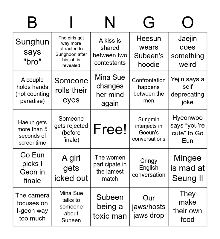 This bingo card has a free space and 24 words: A girl gets icked out, Mina Sue talks to someone about Subeen, Mina Sue changes her mind again, The camera focuses on I-geon way too much, Jaejin does something weird, Sunghun says "bro", A couple holds hands (not counting paradise), The girls get way more attracted to Sunghoon after his job is revealed, Sungmin interjects in Goeun's conversations, The women participate in the lamest match, Confrontation happens between the men, Haeun gets more than 5 seconds of screentime, Cringy English conversation, Mingee is mad at Seung Il, Someone rolls their eyes, Our jaws/hosts jaws drop, Hyeonwoo says “you’re cute” to Go Eun, A kiss is shared between two contestants, Yejin says a self deprecating joke, Someone gets rejected (before finale), They make their own food, Go Eun picks I Geon in finale, Heesun wears Subeen's hoodie and Subeen being a toxic man.