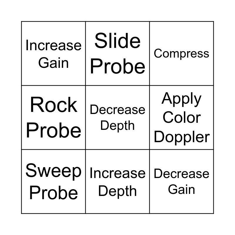 This bingo card has a free space and 10 words: Increase Depth, Compress, Increase Gain, Decrease Gain, Rock Probe, Sweep Probe, Slide Probe, Fan Probe, Apply Color Doppler and Rotate.