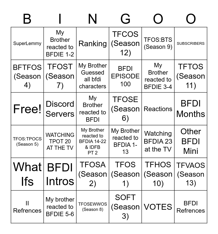 This bingo card has 36 words: TFOS (Season 1), TFOSA (Season 2), SOFT (Season 3), BFTFOS (Season 4), TFOS:TPOCS (Season 5), TFOSE (Season 6), TFOST (Season 7), TFOSEWWOS (Season 8), TFOS:BTS (Season 9), TFHOS (Season 10), TFTOS (Season 11), TFCOS (Season 12), TFVAOS (Season 13), Discord Servers, BFDI EPISODE 100, SuperLemmy, What Ifs, Reactions, Free!, Ranking, My Brother reacted to BFDI, WATCHING TPOT 20 AT THE TV, My Brother reacted to BFDIA 1-13, My Brother reacted to BFDIA 14-22 & IDFB PT 2, Watching BFDIA 23 at the TV, My Brother reacted to BFDIE 1-2, My Brother reacted to BFDIE 3-4, My brother reacted to BFDIE 5-6, My Brother Guessed all bfdi characters, SUBSCRIBERS, BFDI Refrences, II Refrences, Other BFDI Mini, BFDI Months, BFDI Intros and VOTES.