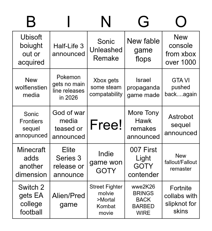 This bingo card has a free space and 24 words: Elite Series 3 release or announce, Alien/Pred game, Xbox gets some steam compatability, Switch 2 gets EA college football, New console from xbox over 1000, Ubisoft boiught out or acquired, New wolfienstien media, Half-Life 3 announced, More Tony Hawk remakes announced, Indie game won GOTY, Israel propaganda game made, Sonic Frontiers sequel annopunced, 007 First Light GOTY contender, New fallout/Fallout remaster, Pokemon gets no main line releases in 2026, wwe2K26 BRINGS BACK BARBED WIRE, Astrobot sequel announced, Sonic Unleashed Remake, GTA VI pushed back....again, God of war media teased or announced, Fortnite collabs with slipknot for skins, Minecraft adds another dimension, New fable game flops and Street Fighter molvie >Mortal Kombat movie.
