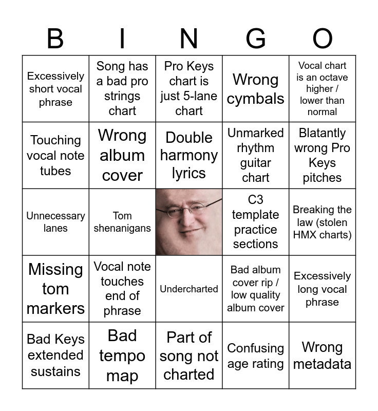 This bingo card has a free space and 24 words: Vocal note touches end of phrase, Bad tempo map, Double harmony lyrics, Bad Keys extended sustains, Vocal chart is an octave higher / lower than normal, Excessively short vocal phrase, Touching vocal note tubes, Song has a bad pro strings chart, C3 template practice sections, Undercharted, Unmarked rhythm guitar chart, Unnecessary lanes, Bad album cover rip / low quality album cover, Excessively long vocal phrase, Wrong album cover, Confusing age rating, Breaking the law (stolen HMX charts), Pro Keys chart is just 5-lane chart, Blatantly wrong Pro Keys pitches, Tom shenanigans, Wrong metadata, Missing tom markers, Wrong cymbals and Part of song not charted.