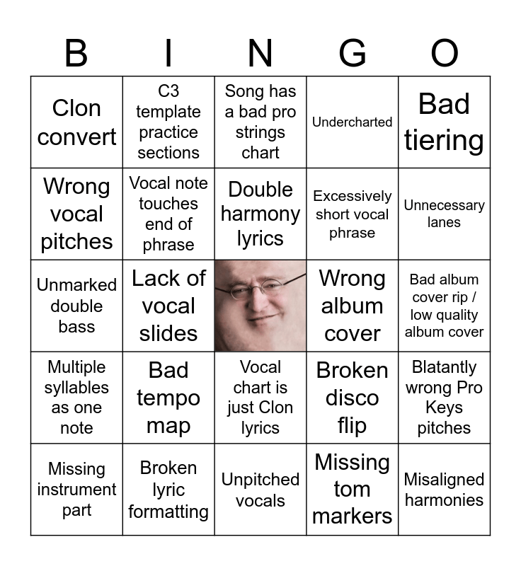This bingo card has a free space and 24 words: Bad tempo map, Broken lyric formatting, Double harmony lyrics, Missing instrument part, Bad tiering, Clon convert, Wrong vocal pitches, C3 template practice sections, Wrong album cover, Vocal chart is just Clon lyrics, Excessively short vocal phrase, Unmarked double bass, Broken disco flip, Blatantly wrong Pro Keys pitches, Vocal note touches end of phrase, Missing tom markers, Bad album cover rip / low quality album cover, Song has a bad pro strings chart, Unnecessary lanes, Lack of vocal slides, Misaligned harmonies, Multiple syllables as one note, Undercharted and Unpitched vocals.