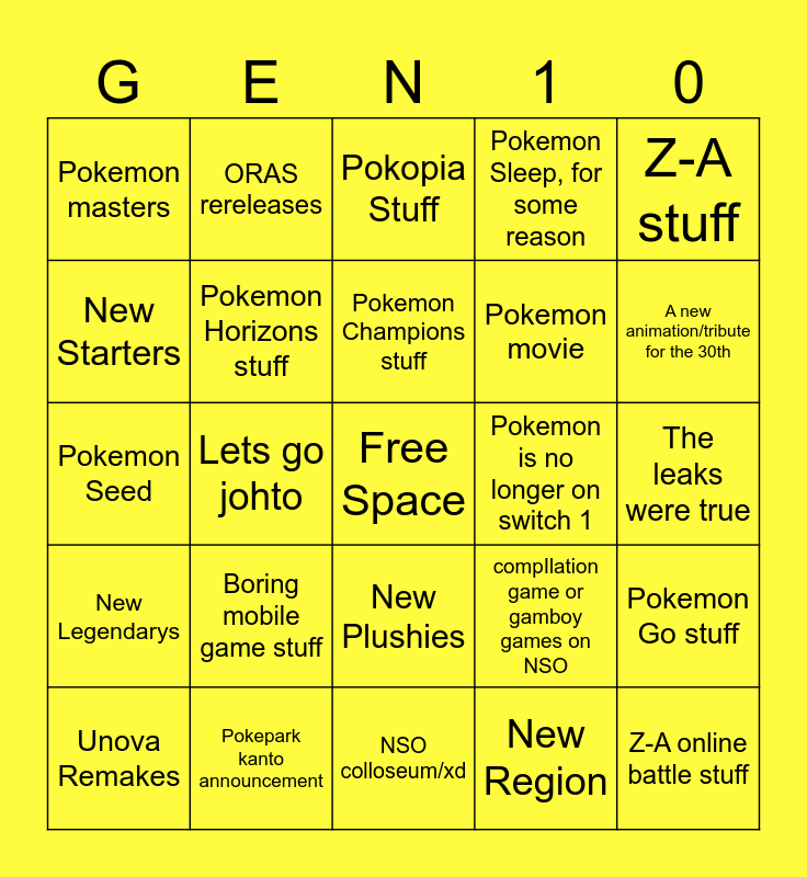 This bingo card has a free space and 24 words: Boring mobile game stuff, Pokepark kanto announcement, Pokemon Champions stuff, Unova Remakes, Z-A stuff, Pokemon masters, New Starters, ORAS rereleases, Pokemon is no longer on switch 1, New Plushies, Pokemon movie, Pokemon Seed, compIlation game or gamboy games on NSO, Pokemon Go stuff, Pokemon Horizons stuff, New Region, The leaks were true, Pokopia Stuff, A new animation/tribute for the 30th, Lets go johto, Z-A online battle stuff, New Legendarys, Pokemon Sleep, for some reason and NSO colloseum/xd.