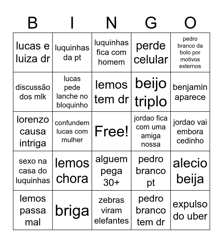 This bingo card has a free space and 24 words: lemos passa mal, lemos chora, lemos tem dr, pedro branco tem dr, pedro branco da bolo por motivos externos, lucas e luiza dr, luquinhas da pt, luquinhas fica com homem, jordao fica com uma amiga nossa, jordao vai embora cedinho, lorenzo causa intriga, lucas pede lanche no bloquinho, pedro branco pt, alecio beija, discussão dos mlk, briga, zebras viram elefantes, perde celular, benjamin aparece, sexo na casa do luquinhas, confundem lucas com mulher, alguem pega 30+, beijo triplo and expulso do uber.