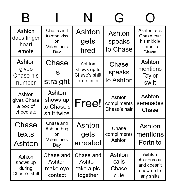 This bingo card has a free space and 24 words: Ashton shows up during Chase’s shift, Chase and Ashton hug on Valentine’s Day, Ashton shows up to Chase’s shift three times, Ashton calls Chase cute, Ashton tells Chase that his middle name is Chase, Ashton does finger heart emote, Chase and Ashton kiss on Valentine’s Day, Ashton gets fired, Ashton compliments Chase’s hair, Ashton serenades Chase, Ashton gives Chase a box of chocolate, Chase is straight, Chase compliments Ashton, Ashton mentions Fortnite, Ashton gives Chase his number, Chase and Ashton make eye contact, Chase and Ashton take a pic together, Ashton speaks to Chase, Ashton mentions Taylor swift, Chase texts Ashton, Ashton shows up to Chase’s shift twice, Ashton gets arrested, Chase speaks to Ashton and Ashton chickens out and doesn’t show up to any shifts.