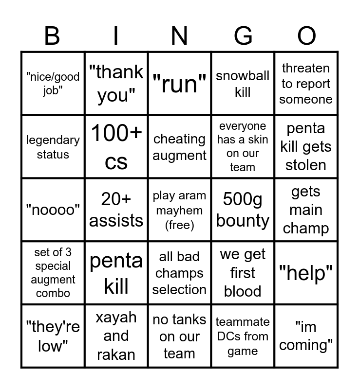 This bingo card has a free space and 24 words: penta kill, xayah and rakan, cheating augment, "they're low", threaten to report someone, "nice/good job", legendary status, "thank you", 500g bounty, all bad champs selection, everyone has a skin on our team, "noooo", we get first blood, "help", 100+ cs, teammate DCs from game, gets main champ, "run", penta kill gets stolen, 20+ assists, "im coming", set of 3 special augment combo, snowball kill and no tanks on our team.