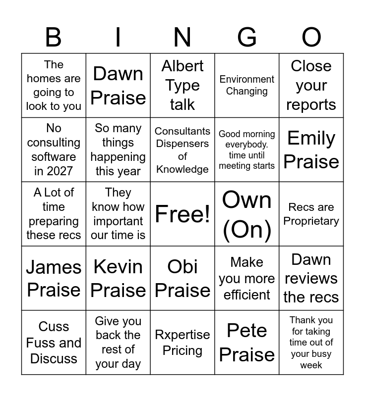 This bingo card has a free space and 24 words: Cuss Fuss and Discuss, Kevin Praise, Consultants Dispensers of Knowledge, Pete Praise, Close your reports, The homes are going to look to you, Dawn Praise, Albert Type talk, Own (On), Recs are Proprietary, A Lot of time preparing these recs, So many things happening this year, Make you more efficient, Dawn reviews the recs, No consulting software in 2027, Give you back the rest of your day, Rxpertise Pricing, Environment Changing, Emily Praise, James Praise, They know how important our time is, Obi Praise, Good morning everybody. time until meeting starts and Thank you for taking time out of your busy week.