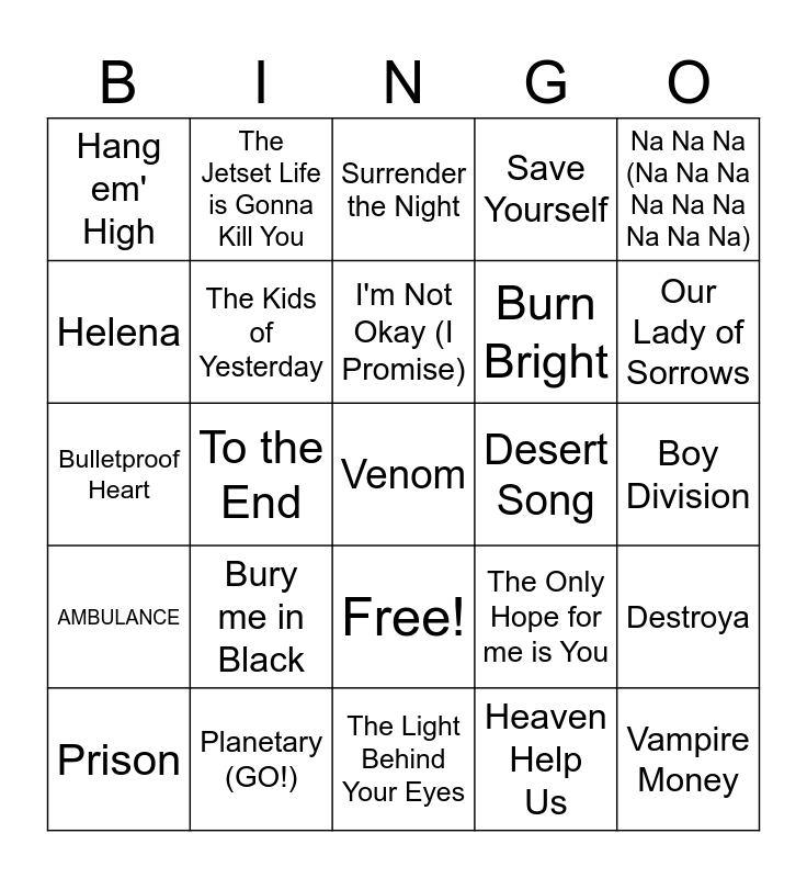 This bingo card has 26 words: Free!, Heaven Help Us, I'm Not Okay (I Promise), Planetary (GO!), Na Na Na (Na Na Na Na Na Na Na Na Na), Hang em' High, Helena, The Jetset Life is Gonna Kill You, Boy Division, The Only Hope for me is You, Burn Bright, Bulletproof Heart, Destroya, Prison, To the End, Demolition Lovers, Save Yourself, AMBULANCE, Surrender the Night, Venom, Our Lady of Sorrows, The Light Behind Your Eyes, Desert Song, Bury me in Black, The Kids of Yesterday and Vampire Money.