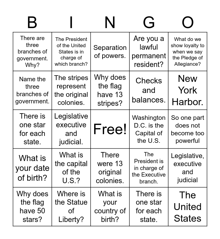 This bingo card has a free space and 24 words: What is the capital of the U.S.?, Where is the Statue of Liberty?, Why does the flag have 13 stripes?, Why does the flag have 50 stars?, What do we show loyalty to when we say the Pledge of Allegiance?, There are three branches of government. Why?, Name the three branches of government., The President of the United States is in charge of which branch?, Washington D.C. is the Capital of the U.S., There were 13 original colonies., Checks and balances., There is one star for each state., The President is in charge of the Executive branch., Legislative, executive and judicial, The stripes represent the original colonies., There is one star for each state., So one part does not become too powerful, Separation of powers., New York Harbor., Legislative executive and judicial., The United States, What is your date of birth?, Are you a lawful permanent resident? and What is your country of birth?.