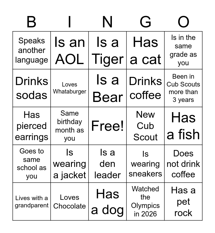 This bingo card has a free space and 33 words: Loves Chick Fil A, Favorite color is red, Same birthday month as you, Born in same year as you, Goes to same school as you, Loves Whataburger, Is in the same grade as you, Lives with a grandparent, Is an AOL, Is a Webelo, Is a Bear, Is a Tiger, Is a Lion, Is a Wolf, New Cub Scout, Been in Cub Scouts more than 3 years, Loves Chocolate, Has pierced earrings, Is wearing a jacket, Is wearing sneakers, Is a den leader, Is or was a cubmaster, Speaks another language, Has a fish, Has a dog, Has a pet rock, Has a cat, Drinks coffee, Drinks sodas, Does not drink coffee, Plays a sport, Watched the Olympics in 2026 and Houston Texans Fan.