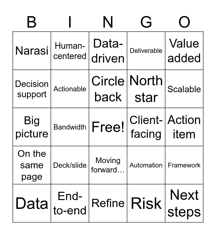 This bingo card has a free space and 41 words: Alignment, Big picture, Quick win, Actionable, End-to-end, Moving forward…, Circle back, Low hanging fruit, Value added, On the same page, Bandwidth, Deliverable, Next steps, Action item, Client-facing, Deck/slide, Storyline, Narasi, Angle-nya, Data-driven, Framework, Iterasi, Refine, North star, Prioritas utama, Trade-off, Risk, Worst/best case, Scalable, Sustainable, AI, Human-centered, Data, Responsible, Automation, Decision support, Playbook, Use case, Dashboard, Pilot and Proof of concept.