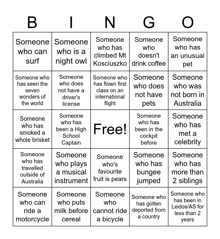 This bingo card has a free space and 55 words: Someone who can make a mean sticky date pudding, Someone who can ride a motorcycle, Someone who can speak a different language, Someone who can surf, Someone who cannot ride a bicycle, Someone who does a martial art, Someone who does not have a driver's license, Someone who does not have a passport, Someone who does not have pets, Someone who does not like chocolate, Someone who doesn't drink coffee, Someone who drinks alternative milk with their coffee, Someone who enjoys pineapple on pizza, Someone who has a boating licence, Someone who has a fishing licence, Someone who has a set off the fire alarm cooking, Someone who has an unusual pet, Someone who has been a High School Captain, Someone who has been in Leidos for longer than 5 years, Someone who has been in Leidos/AS for less than 2 years, Someone who has been in the cockpit before, Someone who has broken a bone, Someone who has bungee jumped, Someone who has climbed Mt Kosciuszko, Someone who has donated blood/plasma, Someone who has flown first class on an international flight, Someone who has gotten deported from a country, Someone who has had their driver's licence suspended/revoked, Someone who has met a celebrity, Someone who has more than 2 siblings, Someone who has more than two tattoos, Someone who has never been on a plane, Someone who has not broken a bone, Someone who has run a marathon, Someone who has seen the seven wonders of the world, Someone who has smoked a whole brisket, Someone who has the same hobby as you __________, Someone who has travelled outside of Australia, Someone who has two passports, Someone who has visited the arctic, Someone who is a night owl, Someone who is left-handed, Someone who liked the Star War Sequel Trilogy, Someone who loves baked beans, Someone who plays a musical instrument, Someone who puts milk before cereal, Someone who snowboards, Someone who was born in Canberra, Someone who was born in the same month as you, Someone who was not born in Australia, Someone who's a published author (can be academic), Someone who's favourite colour is orange, Someone who's favourite cuisine is Mongolian, Someone who's favourite fruit is pears and Someone who's got more than 1000 unread emails in their personal or work account.