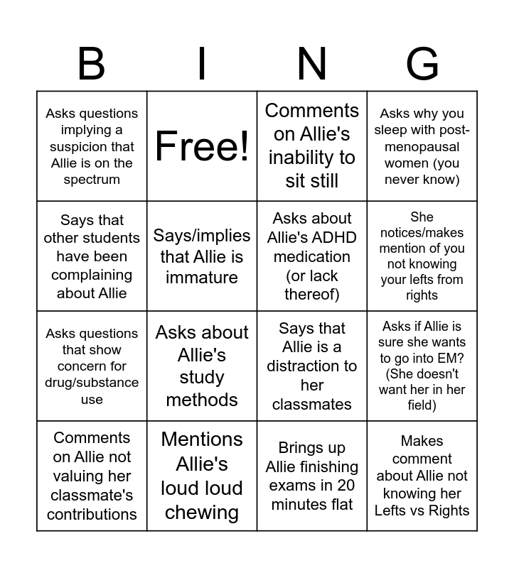 This bingo card has 19 words: Says that Allie is a distraction to her classmates, Says that Allie could "work better as a team member", Comments on Allie's inability to sit still, Makes comment about Allie not knowing her Lefts vs Rights, Asks if Allie is sure she wants to go into EM? (She doesn't want her in her field), Says that other students have been complaining about Allie, Brings up Allie finishing exams in 20 minutes flat, Asks questions implying a suspicion that Allie is on the spectrum, Free!, Asks questions that show concern for drug/substance use, Asks about Allie's study methods, Says/implies that Allie is immature, Asks about Allie's ADHD medication (or lack thereof), Mentions Allie's loud loud chewing, Comments on Allie not valuing her classmate's contributions, She brings up Allie's lack of knowledge regarding immunology, Asks why you sleep with post-menopausal women (you never know), She notices/makes mention of you not knowing your lefts from rights and She brings up your lack of knowledge regarding immunology.