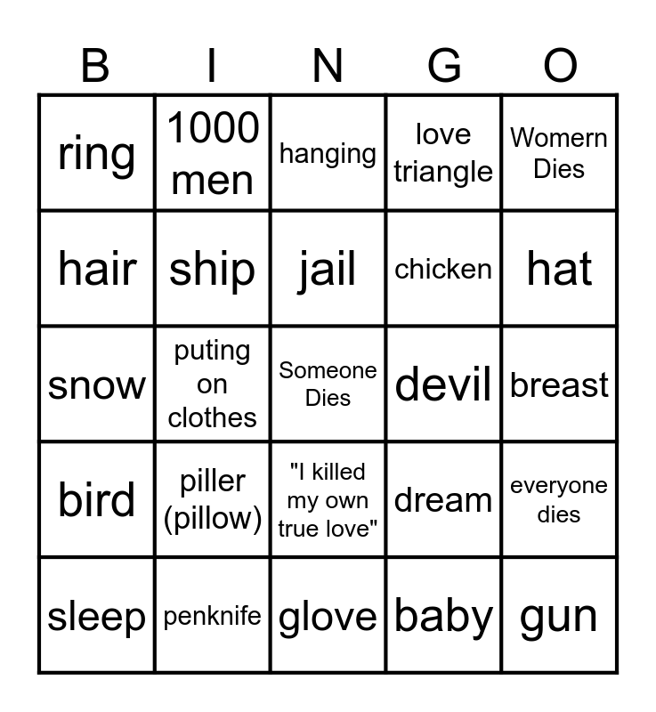 This bingo card has a free space and 59 words: poison, penknife, railroad, bird, baby, river, ship, wine, chicken, horse, love triangle, ghost, hair, sea, stars, ring, gun, Womern Dies, feller dies, jail, devil, hanging, sleep, everyone dies, tree, gate, footwear, bridge, hat, soldier, wagon, finger, hand, bed, 1000 men, grave plant, gold, puting on clothes, taking off clothes, snow, rain, piller (pillow), breast, apron, Corpse Smooch, cuss word, "Come all ye...", cheek, "I killed my own true love", glove, knee, eyes, woe, letter, blood, dream, sword, Head Cut Off and lowland.