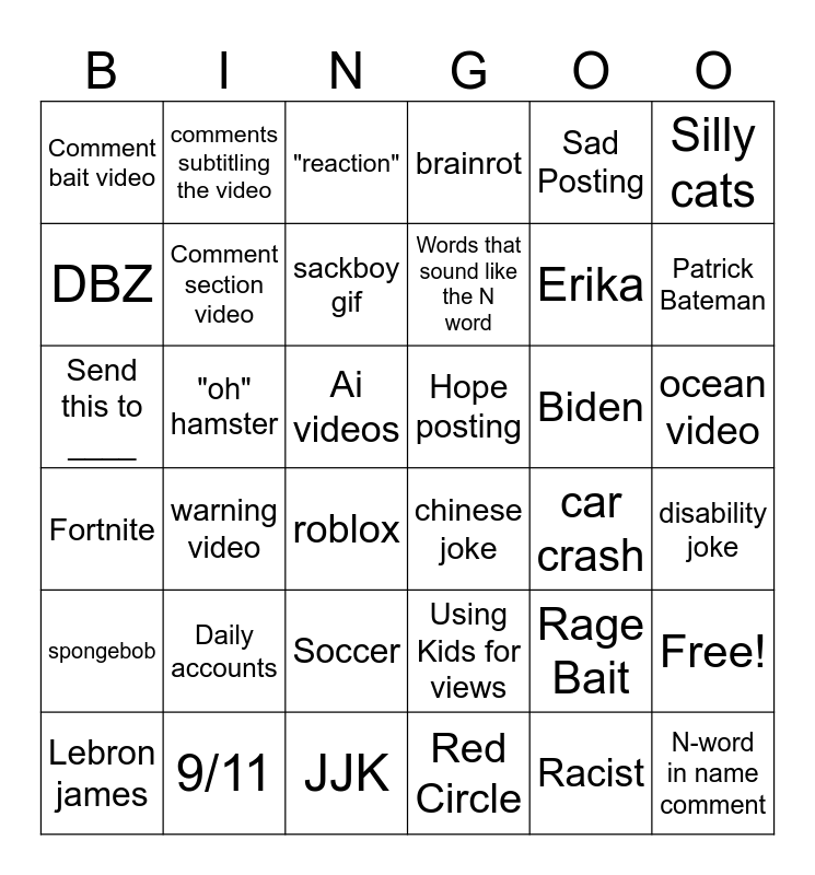 This bingo card has 36 words: Using Kids for views, Soccer, Red Circle, DBZ, Fortnite, Hope posting, Comment section video, JJK, Sad Posting, Rage Bait, Patrick Bateman, brainrot, Free!, "oh" hamster, Words that sound like the N word, Comment bait video, spongebob, Biden, Send this to ____, "reaction", Ai videos, warning video, chinese joke, roblox, car crash, comments subtitling the video, Erika, 9/11, sackboy gif, Silly cats, N-word in name comment, Lebron james, disability joke, ocean video, Daily accounts and Racist.