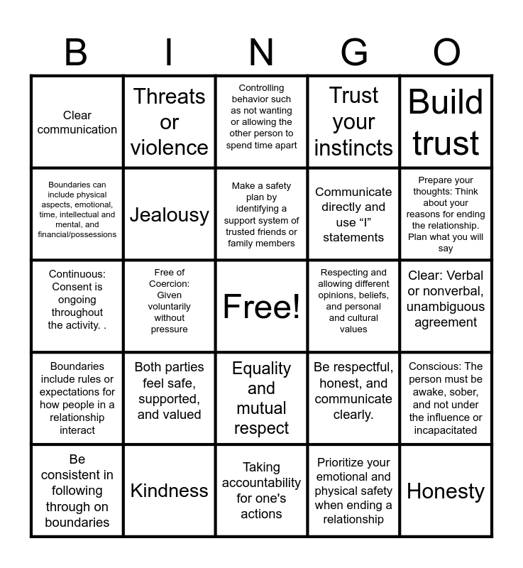 This bingo card has a free space and 24 words: Both parties feel safe, supported, and valued, Kindness, Make a safety plan by identifying a support system of trusted friends or family members, Be consistent in following through on boundaries, Build trust, Clear communication, Boundaries can include physical aspects, emotional, time, intellectual and mental, and financial/possessions, Threats or violence, Respecting and allowing different opinions, beliefs, and personal and cultural values, Equality and mutual respect, Communicate directly and use āIā statements, Continuous: Consent is ongoing throughout the activity. ., Be respectful, honest, and communicate clearly., Conscious: The person must be awake, sober, and not under the influence or incapacitated, Jealousy, Prioritize your emotional and physical safety when ending a relationship, Clear: Verbal or nonverbal, unambiguous agreement, Controlling behavior such as not wanting or allowing the other person to spend time apart, Prepare your thoughts: Think about your reasons for ending the relationship. Plan what you will say, Free of Coercion: Given voluntarily without pressure, Honesty, Boundaries include rules or expectations for how people in a relationship interact, Trust your instincts and Taking accountability for one's actions.
