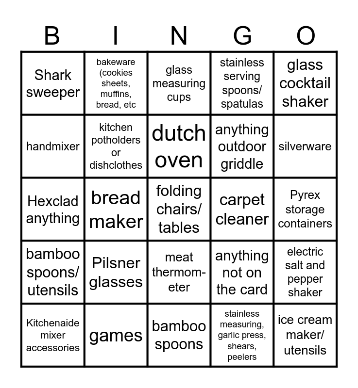 This bingo card has 25 words: Pilsner glasses, bamboo spoons, dutch oven, Kitchenaide mixer accessories, glass cocktail shaker, Shark sweeper, handmixer, bakeware (cookies sheets, muffins, bread, etc, carpet cleaner, meat thermom-eter, anything outdoor griddle, Hexclad anything, anything not on the card, electric salt and pepper shaker, kitchen potholders or dishclothes, ice cream maker/ utensils, Pyrex storage containers, glass measuring cups, silverware, bread maker, folding chairs/ tables, games, bamboo spoons/ utensils, stainless serving spoons/ spatulas and stainless measuring, garlic press, shears, peelers.