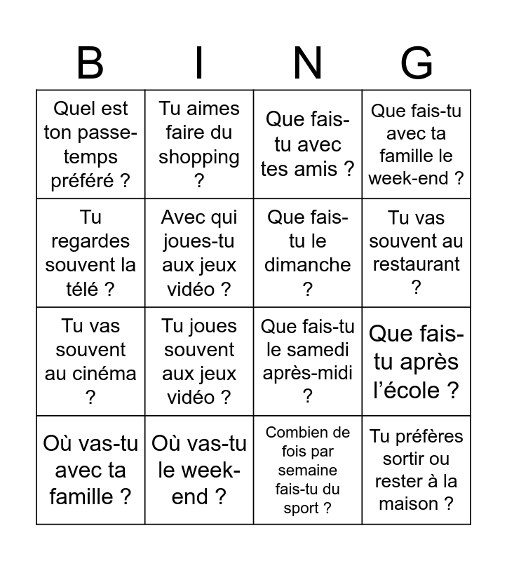 This bingo card has 16 words: Où vas-tu le week-end ?, Que fais-tu après l’école ?, Que fais-tu avec tes amis ?, Quel est ton passe-temps préféré ?, Tu vas souvent au cinéma ?, Tu aimes faire du shopping ?, Que fais-tu le samedi après-midi ?, Combien de fois par semaine fais-tu du sport ?, Tu regardes souvent la télé ?, Avec qui joues-tu aux jeux vidéo ?, Où vas-tu avec ta famille ?, Que fais-tu avec ta famille le week-end ?, Tu joues souvent aux jeux vidéo ?, Tu vas souvent au restaurant ?, Que fais-tu le dimanche ? and Tu préfères sortir ou rester à la maison ?.