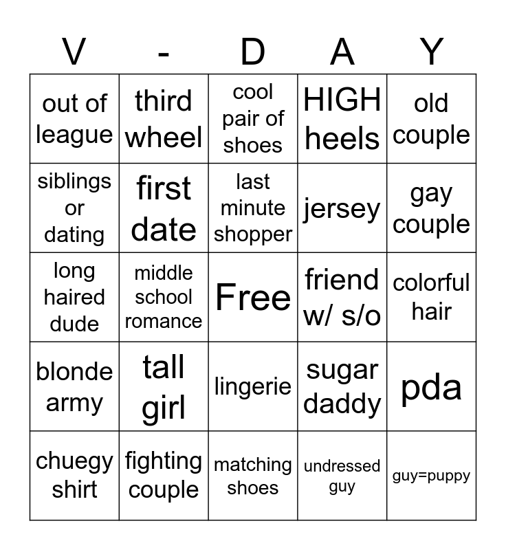 This bingo card has a free space and 24 words: chuegy shirt, tall girl, last minute shopper, undressed guy, old couple, out of league, third wheel, cool pair of shoes, friend w/ s/o, colorful hair, long haired dude, first date, sugar daddy, pda, siblings or dating, fighting couple, matching shoes, HIGH heels, gay couple, blonde army, middle school romance, lingerie, jersey and guy=puppy.