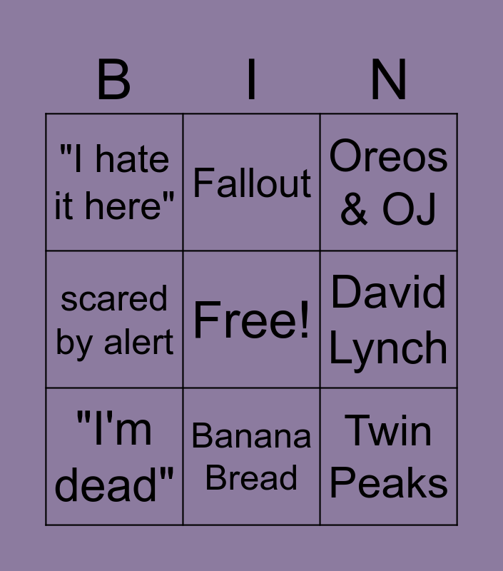 This bingo card has a free space and 12 words: Silent Hill, Resident Evil, Twin Peaks, David Lynch, Fallout, Oreos & OJ, Banana Bread, Bones, "I hate it here", scared by alert, "I'm dead" and Camera zooms but doesn't focus.