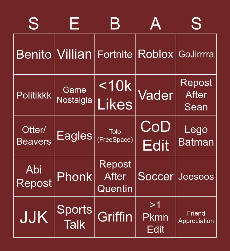 This bingo card has a free space and 29 words: JJK, JJBA, Eagles, I <3 GF, Benito, Fortnite, Game Nostalgia, Phonk, CoD Edit, Sports Talk, Lego Batman, Friend Appreciation, Griffin, >1 Pkmn Edit, Repost After Sean, Repost After Jayden, Repost After Quentin, Abi Repost, GoJirrrra, Otter/ Beavers, Soccer, OW/OW2, Vader, Politikkk, Roblox, Villian, Jeesoos, <10k Likes and Back 2 Back.