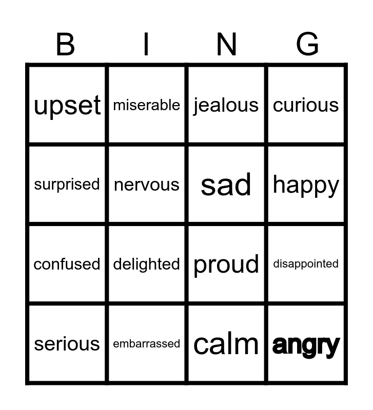 This bingo card has 16 words: embarrassed, disappointed, jealous, upset, confused, miserable, proud, calm, surprised, nervous, serious, curious, delighted, happy, sad and angry.