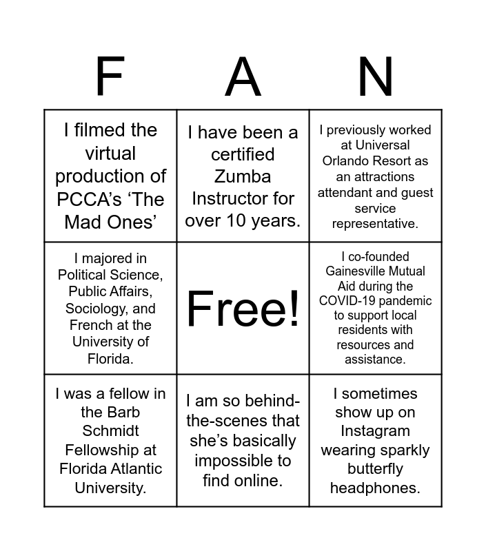 This bingo card has a free space and 9 words: I was a fellow in the Barb Schmidt Fellowship at Florida Atlantic University., I previously worked at Universal Orlando Resort as an attractions attendant and guest service representative., I have been a certified Zumba Instructor for over 10 years., I majored in Political Science, Public Affairs, Sociology, and French at the University of Florida., I filmed the virtual production of PCCA’s ‘The Mad Ones’, I co-founded Gainesville Mutual Aid during the COVID-19 pandemic to support local residents with resources and assistance., I sometimes show up on Instagram wearing sparkly butterfly headphones., I am based in Wellington, Florida. and I am so behind-the-scenes that she’s basically impossible to find online..