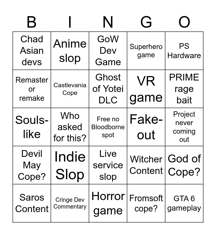 This bingo card has a free space and 24 words: Indie Slop, Cringe Dev Commentary, Ghost of Yotei DLC, Saros Content, PS Hardware, Chad Asian devs, Remaster or remake, Anime slop, Fake-out, Live service slop, VR game, Souls-like, Witcher Content, God of Cope?, Castlevania Cope, Fromsoft cope?, Project never coming out, GoW Dev Game, PRIME rage bait, Who asked for this?, GTA 6 gameplay, Devil May Cope?, Superhero game and Horror game.