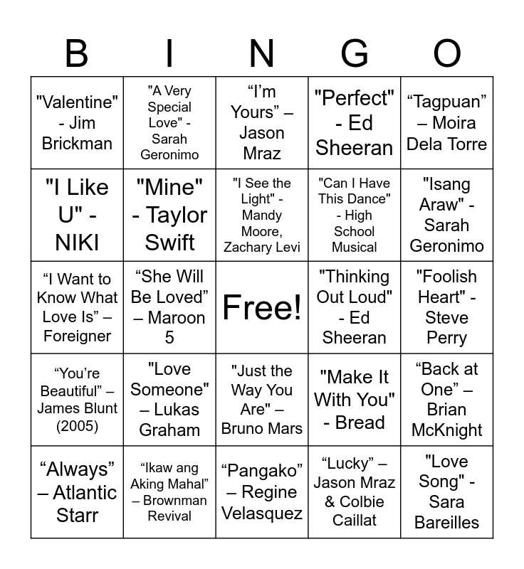This bingo card has a free space and 43 words: "Time After Time" – Cyndi Lauper, "Love Song" - Sara Bareilles, “Careless Whisper” – George Michael, “Always” – Atlantic Starr, “We Belong Together” – Mariah Carey, “Lucky” – Jason Mraz & Colbie Caillat, “I’m Yours” – Jason Mraz, “Kahit Maputi Na ang Buhok Ko” – Rey Valera, “Tagpuan” – Moira Dela Torre, “Ikaw ang Aking Mahal” – Brownman Revival, "Perfect" - Ed Sheeran, "Thinking Out Loud" - Ed Sheeran, "Just the Way You Are" – Bruno Mars, "Love Someone" – Lukas Graham, "Ikaw" – Yeng Constantino, “Pangako” – Regine Velasquez, “A Thousand Miles” – Vanessa Carlton, “I Want to Know What Love Is” – Foreigner, “Truly, Madly, Deeply” – Savage Garden, "Isang Araw" - Sarah Geronimo, "A Very Special Love" - Sarah Geronimo, "Exchange of Hearts" - David Slater, "All This Time" - Tiffany, "Valentine" - Jim Brickman, "You're Still The One" - Shania Twain, "Foolish Heart" - Steve Perry, "Through The Years" - Kenny Rogers, "When I Met You" - APO Hiking Society, "Make It With You" - Bread, “You’re Beautiful” – James Blunt (2005), “As Long as You Love Me” – Backstreet Boys, “Back at One” – Brian McKnight, “This I Promise You” – *NSYNC, “She Will Be Loved” – Maroon 5, "Never Knew I Needed" - Ne-Yo, "A Whole New World" - Lea Salonga, Brad Kane, "Beauty and the Beast" - Angela Lansburry, "I See the Light" - Mandy Moore, Zachary Levi, "I Like U" - NIKI, "Can I Have This Dance" - High School Musical, "Ours" - Taylor Swift, "Mine" - Taylor Swift and "You Are the Music in Me" - High School Musical.