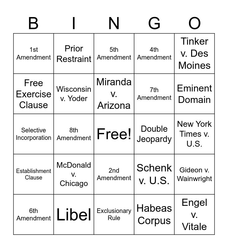This bingo card has a free space and 24 words: McDonald v. Chicago, Libel, Miranda v. Arizona, 6th Amendment, Tinker v. Des Moines, 1st Amendment, Free Exercise Clause, Prior Restraint, Double Jeopardy, 2nd Amendment, 7th Amendment, Selective Incorporation, Schenk v. U.S., Gideon v. Wainwright, Wisconsin v. Yoder, Habeas Corpus, New York Times v. U.S., 5th Amendment, Eminent Domain, 8th Amendment, Engel v. Vitale, Establishment Clause, 4th Amendment and Exclusionary Rule.