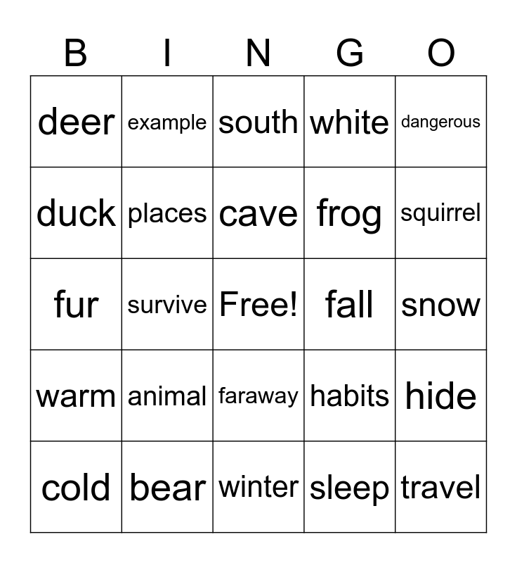 This bingo card has a free space and 24 words: animal, bear, cave, cold, dangerous, deer, duck, example, fall, faraway, frog, fur, habits, hide, places, sleep, snow, south, squirrel, survive, travel, warm, white and winter.