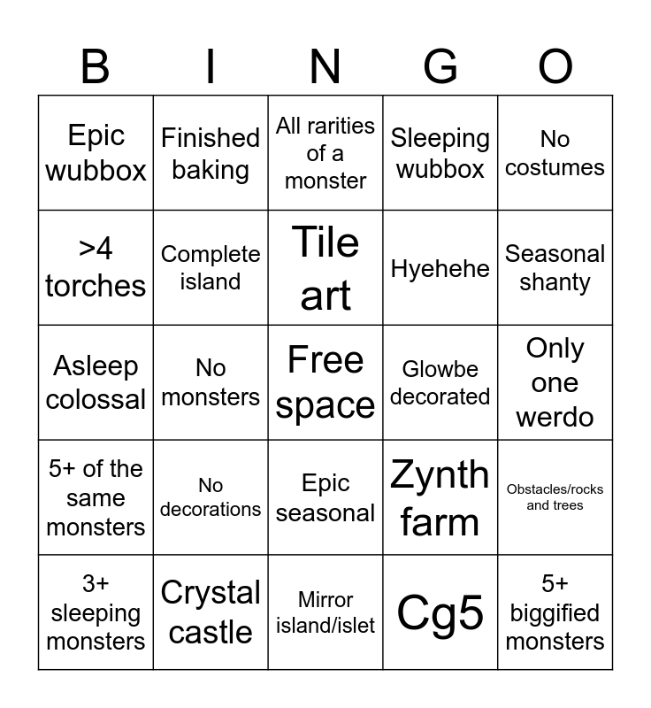 This bingo card has a free space and 29 words: 3+ sleeping monsters, Bad composer/meme composer, No monsters, Sped up/slowed down island, Epic wubbox, All rarities of a monster, Complete island, No decorations, Glowbe decorated, Crystal castle, Only one werdo, 5+ biggified monsters, Mirror island/islet, Cg5, Seasonal shanty, Empty breeding hut or nursery, Epic seasonal, 5+ of the same monsters, No costumes, Asleep colossal, Zynth farm, Tribal, Hyehehe, >4 torches, Sleeping wubbox, Finished baking, Obstacles/rocks and trees, Tile art and 1mil starpower.