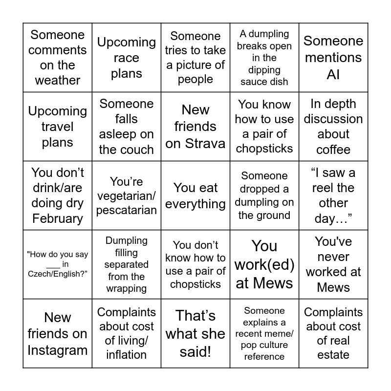 This bingo card has 25 words: Dumpling filling separated from the wrapping, That’s what she said!, New friends on Strava, New friends on Instagram, Someone mentions AI, Someone comments on the weather, Upcoming travel plans, Upcoming race plans, Someone dropped a dumpling on the ground, You don’t know how to use a pair of chopsticks, You know how to use a pair of chopsticks, You don’t drink/are doing dry February, You work(ed) at Mews, You've never worked at Mews, Someone falls asleep on the couch, Complaints about cost of real estate, “I saw a reel the other day…”, Someone tries to take a picture of people, In depth discussion about coffee, You’re vegetarian/ pescatarian, You eat everything, Complaints about cost of living/ inflation, "How do you say ___ in Czech/English?”, A dumpling breaks open in the dipping sauce dish and Someone explains a recent meme/ pop culture reference.