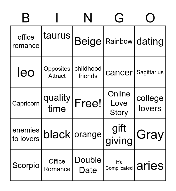 This bingo card has a free space and 68 words: red, aries, physical touch, friends to lovers, single (and ready to mingle), pink, taurus, words of affirmation, childhood friends, married, orange, gemini, college lovers, dating, green, leo, quality time, office romance, courting someone, black, cancer, gift giving, enemies to lovers, in a situationship, Blue, Brown, Yellow, White, Gray, Purple, Beige, Maroon, Navy Blue, White, Rainbow, Virgo, Libra, Scorpio, Sagittarius, Capricorn, Aquarius, Pisces, Opposites Attract, High School Sweethearts, First Love, Roommates to Lovers, Bestfriend's Sibling, Neighbors to Lovers, Online Love Story, Office Romance, Love at First Sight, Friend-of-a-friend, Orgmates to Lovers, Double Date, Second Chance, Just Friends, It's Complicated, Friendzoned, Engaged, Moving on, NGSB/NBSB, Talking Stage, Self-love, Work First, LDR, Currently Healing, Independent Era and Not Interested.