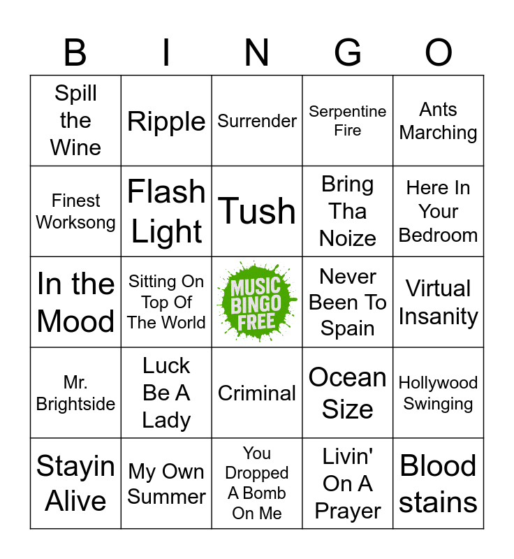 This bingo card has a free space and 43 words: Dirty Deeds Done Dirt Cheap, Blood stains, I Stay Away, Stayin Alive, Positive Vibration, Livin' On A Prayer, Surrender, Saturday in the Park, Ants Marching, My Own Summer, Serpentine Fire, Never Been To Spain, Criminal, Luck Be A Lady, Take Me Out, You Dropped A Bomb On Me, The Race Is On, In the Mood, Vacation, Here In Your Bedroom, Ripple, Flagpole Sitta, Earthquake and Fire, Spill the Wine, Dancing Machine, Virtual Insanity, Right Here Right Now, Banana Pancakes, Ocean Size, Mr. Brightside, Rock Your Body, Hollywood Swinging, Move on Up, Sitting On Top Of The World, What A Wonderful World, On The Hunt, Cute Without The 'E', Tush, Finest Worksong, Bring Tha Noize, Synchronicity II, Flash Light and Love Roller coaster.
