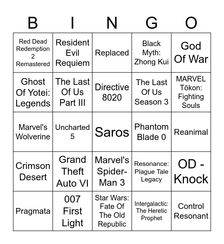 This bingo card has a free space and 24 words: Grand Theft Auto VI, 007 First Light, Directive 8020, Pragmata, God Of War, Red Dead Redemption 2 Remastered, Ghost Of Yotei: Legends, Resident Evil Requiem, Phantom Blade 0, Marvel's Spider-Man 3, The Last Of Us Season 3, Marvel's Wolverine, Resonance: Plague Tale Legacy, OD -Knock, The Last Of Us Part III, Intergalactic: The Heretic Prophet, Reanimal, Replaced, MARVEL Tōkon: Fighting Souls, Uncharted 5, Control Resonant, Crimson Desert, Black Myth: Zhong Kui and Star Wars: Fate Of The Old Republic.