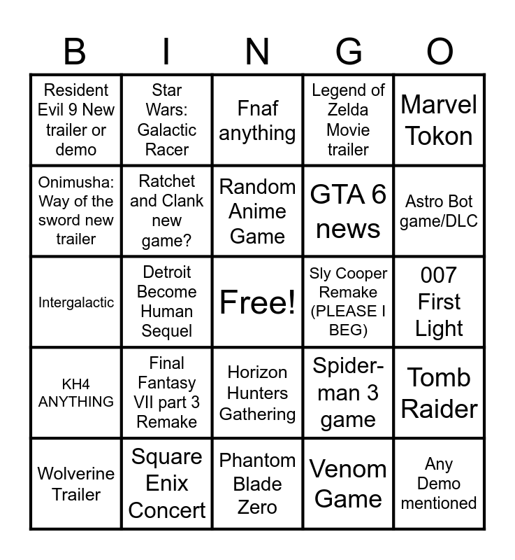 This bingo card has a free space and 24 words: Final Fantasy VII part 3 Remake, Square Enix Concert, Random Anime Game, Wolverine Trailer, Marvel Tokon, Resident Evil 9 New trailer or demo, Onimusha: Way of the sword new trailer, Star Wars: Galactic Racer, Sly Cooper Remake (PLEASE I BEG), Horizon Hunters Gathering, GTA 6 news, Intergalactic, Spider-man 3 game, Tomb Raider, Ratchet and Clank new game?, Venom Game, 007 First Light, Fnaf anything, Astro Bot game/DLC, Detroit Become Human Sequel, Any Demo mentioned, KH4 ANYTHING, Legend of Zelda Movie trailer and Phantom Blade Zero.