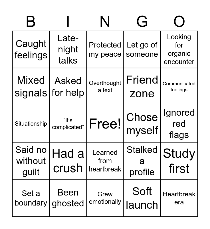 This bingo card has a free space and 24 words: Had a crush, Been ghosted, Overthought a text, Set a boundary, Looking for organic encounter, Caught feelings, Mixed signals, Late-night talks, Chose myself, Learned from heartbreak, Friend zone, Situationship, Stalked a profile, Study first, Asked for help, Soft launch, Ignored red flags, Protected my peace, Communicated feelings, “It’s complicated”, Heartbreak era, Said no without guilt, Let go of someone and Grew emotionally.