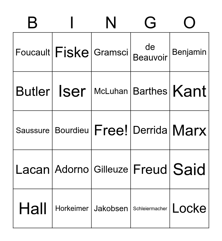 This bingo card has a free space and 24 words: Adorno, Horkeimer, McLuhan, Hall, Benjamin, Foucault, Butler, Fiske, Derrida, Gilleuze, Barthes, Saussure, Freud, Said, Iser, Schleiermacher, Marx, Gramsci, Kant, Bourdieu, Locke, Lacan, de Beauvoir and Jakobsen.