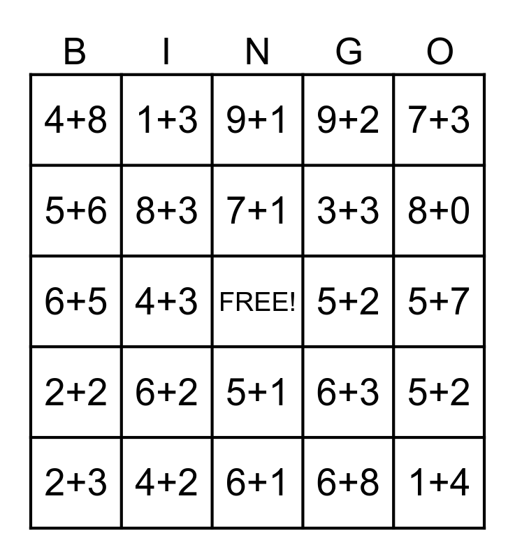 This bingo card has a free space and 78 words: 4+1, 7+2, 9+1, 2+6, 2+5, 3+1, 7+5, 3+2, 2+1, 1+6, 6+4, 3+4, 9+2, 4+8, 3+5, 5+6, 8+0, 6+2, 2+7, 5+7, 1+6, 7+3, 6+5, 7+1, 8+3, 5+4, 4+1, 5+5, 1+1, 1+5, 8+0, 2+8, 6+1, 3+6, 2+3, 5+2, 3+3, 2+2, 9+3, 1+4, 5+3, 2+4, 8+4, 6+7, 1+7, 1+3, 1+2, 8+1, 3+8, 4+4, 5+2, 4+3, 6+3, 3+7, 7+0, 4+5, 6+6, 3+8, 8+2, 5+1, 3+3, 0+1, 1+8, 7+4, 4+7, 8+5, 2+6, 6+3, 2+2, 4+2, 5+6, 8+1, 1+5, 4+6, 6+8, 7+2, 3+2 and 2+1.