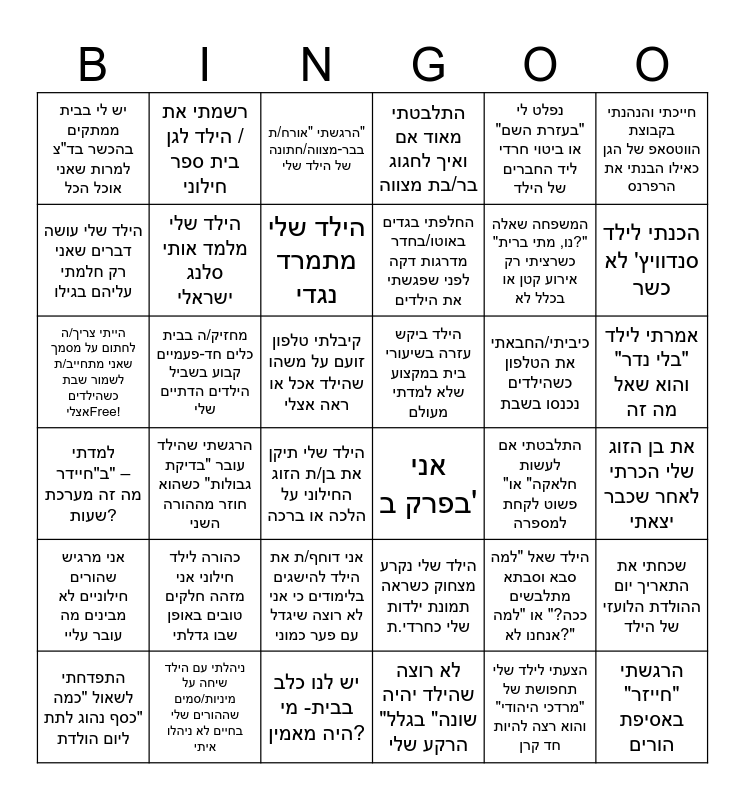 This bingo card has 36 words: הילד שלי נקרע מצחוק כשראה תמונת ילדות שלי כחרדי.ת, אני דוחף/ת את הילד להישגים בלימודים כי אני לא רוצה שיגדל עם פער כמוני, לא רוצה שהילד יהיה "שונה" בגלל הרקע שלי, הילד שלי עושה דברים שאני רק חלמתי עליהם בגילו, למדתי ב"חיידר" – מה זה מערכת שעות?, הילד ביקש עזרה בשיעורי בית במקצוע שלא למדתי מעולם, הילד שלי מלמד אותי סלנג ישראלי, יש לנו כלב בבית- מי היה מאמין?, נפלט לי "בעזרת השם" או ביטוי חרדי ליד החברים של הילד, הילד שאל "למה סבא וסבתא מתלבשים ככה?" או "למה אנחנו לא?", הכנתי לילד סנדוויץ' לא כשר, התלבטתי מאוד אם ואיך לחגוג בר/בת מצווה, שכחתי את התאריך יום ההולדת הלועזי של הילד, מחזיק/ה בבית כלים חד-פעמיים קבוע בשביל הילדים הדתיים שלי, החלפתי בגדים באוטו/בחדר מדרגות דקה לפני שפגשתי את הילדים, יש לי בבית ממתקים בהכשר בד"צ למרות שאני אוכל הכל, אני מרגיש שהורים חילוניים לא מבינים מה עובר עליי, כיביתי/החבאתי את הטלפון כשהילדים נכנסו בשבת, הייתי צריך/ה לחתום על מסמך שאני מתחייב/ת לשמור שבת כשהילדים אצליFree!, הרגשתי "אורח/ת" בבר-מצווה/חתונה של הילד שלי, קיבלתי טלפון זועם על משהו שהילד אכל או ראה אצלי, הרגשתי שהילד עובר "בדיקת גבולות" כשהוא חוזר מההורה השני, אני בפרק ב', הילד שלי תיקן את בן/ת הזוג החילוני על הלכה או ברכה, התלבטתי אם לעשות "חלאקה" או פשוט לקחת למספרה, רשמתי את הילד לגן / בית ספר חילוני, המשפחה שאלה "נו, מתי ברית?" כשרציתי רק אירוע קטן או בכלל לא, ניהלתי עם הילד שיחה על מיניות/סמים שההורים שלי בחיים לא ניהלו איתי, הילד שלי מתמרד נגדי, חייכתי והנהנתי בקבוצת הווטסאפ של הגן כאילו הבנתי את הרפרנס, הרגשתי "חייזר" באסיפת הורים, התפדחתי לשאול "כמה כסף נהוג לתת" ליום הולדת, את בן הזוג שלי הכרתי לאחר שכבר יצאתי, אמרתי לילד "בלי נדר" והוא שאל מה זה, כהורה לילד חילוני אני מזהה חלקים טובים באופן שבו גדלתי and הצעתי לילד שלי תחפושת של "מרדכי היהודי" והוא רצה להיות חד קרן.
