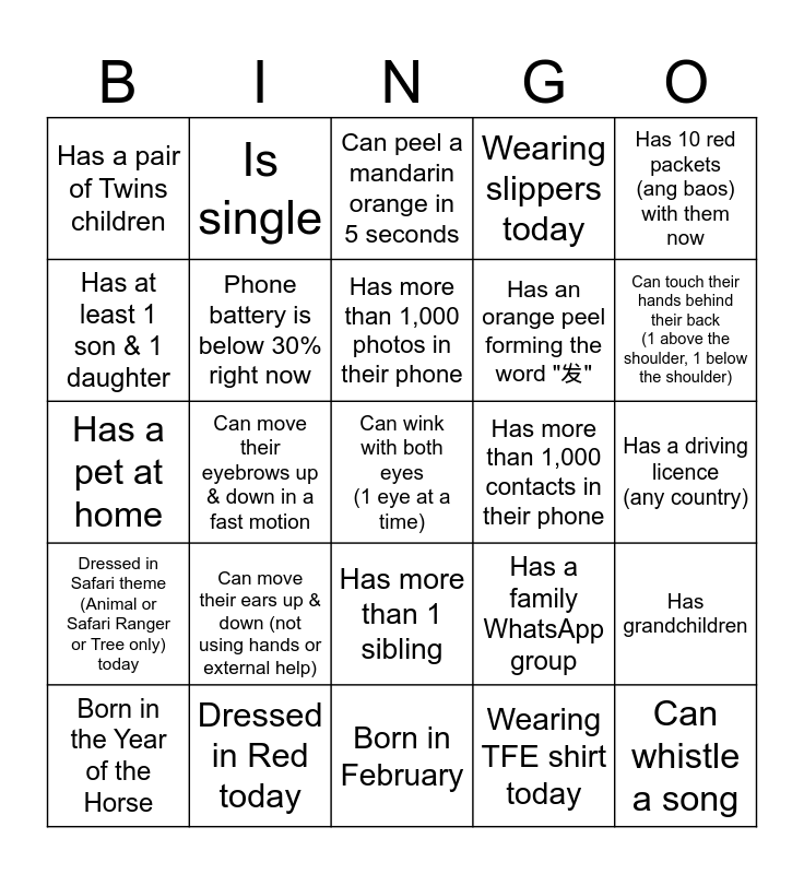 This bingo card has 25 words: Can move their ears up & down (not using hands or external help), Born in February, Has more than 1,000 photos in their phone, Born in the Year of the Horse, Has 10 red packets (ang baos) with them now, Has a pair of Twins children, Has at least 1 son & 1 daughter, Is single, Has more than 1,000 contacts in their phone, Has more than 1 sibling, Has an orange peel forming the word "发", Has a pet at home, Has a family WhatsApp group, Has grandchildren, Phone battery is below 30% right now, Can whistle a song, Has a driving licence (any country), Can peel a mandarin orange in 5 seconds, Can touch their hands behind their back (1 above the shoulder, 1 below the shoulder), Can move their eyebrows up & down in a fast motion, Can wink with both eyes (1 eye at a time), Dressed in Red today, Dressed in Safari theme (Animal or Safari Ranger or Tree only) today, Wearing slippers today and Wearing TFE shirt today.
