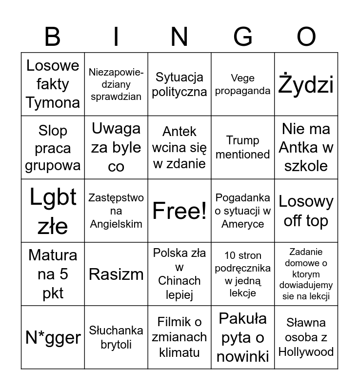 This bingo card has a free space and 24 words: N*gger, Rasizm, Antek wcina się w zdanie, Pakuła pyta o nowinki, Żydzi, Losowe fakty Tymona, Niezapowie-dziany sprawdzian, Sytuacja polityczna, Pogadanka o sytuacji w Ameryce, Losowy off top, Lgbt złe, Uwaga za byle co, 10 stron podręcznika w jedną lekcje, Zadanie domowe o ktorym dowiadujemy sie na lekcji, Slop praca grupowa, Słuchanka brytoli, Filmik o zmianach klimatu, Vege propaganda, Nie ma Antka w szkole, Matura na 5 pkt, Zastępstwo na Angielskim, Polska zła w Chinach lepiej, Trump mentioned and Sławna osoba z Hollywood.