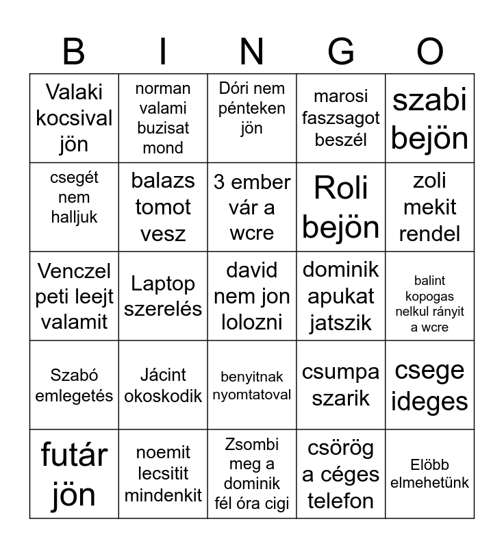 This bingo card has 25 words: Jácint okoskodik, Zsombi meg a dominik fél óra cigi, 3 ember vár a wcre, futár jön, szabi bejön, Valaki kocsival jön, csegét nem halljuk, norman valami buzisat mond, dominik apukat jatszik, benyitnak nyomtatoval, Roli bejön, Venczel peti leejt valamit, csumpa szarik, csege ideges, balazs tomot vesz, Elöbb elmehetünk, balint kopogas nelkul rányit a wcre, Dóri nem pénteken jön, zoli mekit rendel, Laptop szerelés, david nem jon lolozni, noemit lecsitit mindenkit, Szabó emlegetés, marosi faszsagot beszél and csörög a céges telefon.