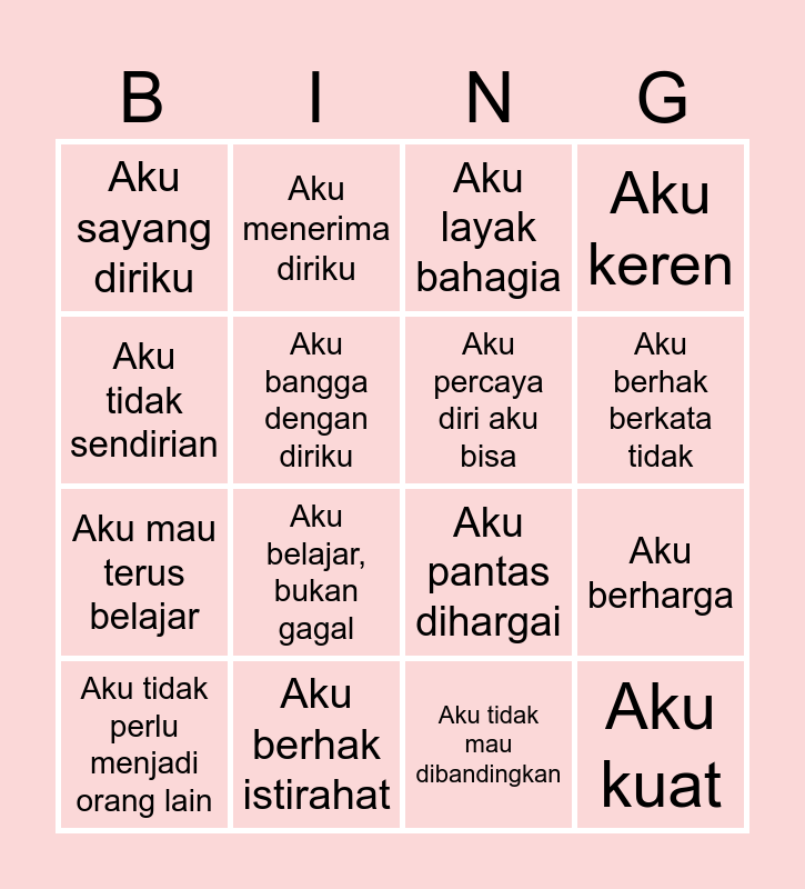 This bingo card has 16 words: Aku berhak istirahat, Aku berharga, Aku layak bahagia, Aku sayang diriku, Aku mau terus belajar, Aku menerima diriku, Aku pantas dihargai, Aku tidak mau dibandingkan, Aku tidak sendirian, Aku bangga dengan diriku, Aku tidak perlu menjadi orang lain, Aku keren, Aku belajar, bukan gagal, Aku berhak berkata tidak, Aku percaya diri aku bisa and Aku kuat.