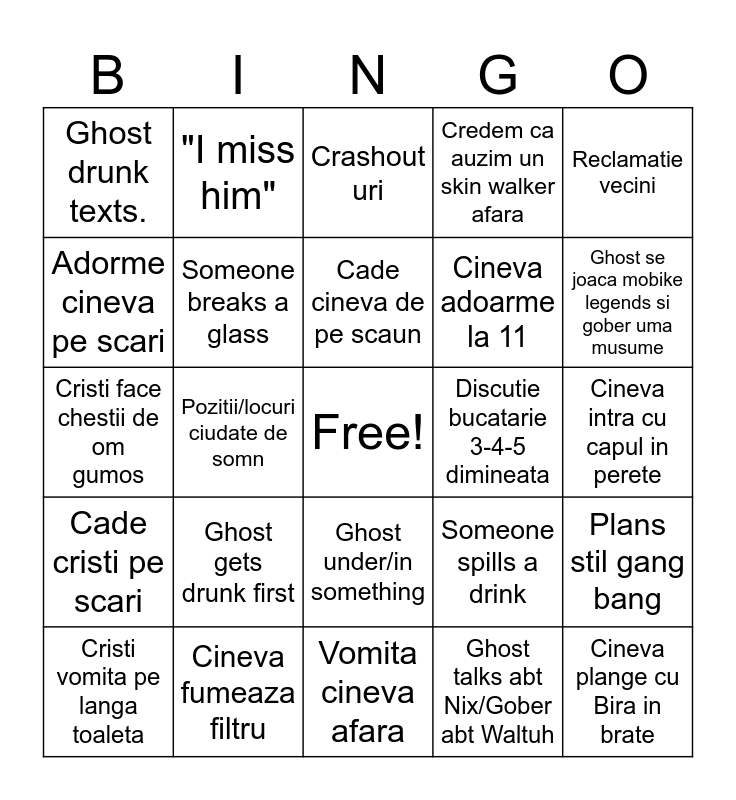 This bingo card has a free space and 24 words: Ghost gets drunk first, Cineva fumeaza filtru, Cade cineva de pe scaun, Cristi vomita pe langa toaleta, Reclamatie vecini, Ghost drunk texts., Adorme cineva pe scari, "I miss him", Discutie bucatarie 3-4-5 dimineata, Ghost under/in something, Cineva adoarme la 11, Cristi face chestii de om gumos, Someone spills a drink, Plans stil gang bang, Someone breaks a glass, Ghost talks abt Nix/Gober abt Waltuh, Cineva intra cu capul in perete, Crashout uri, Ghost se joaca mobike legends si gober uma musume, Pozitii/locuri ciudate de somn, Cineva plange cu Bira in brate, Cade cristi pe scari, Credem ca auzim un skin walker afara and Vomita cineva afara.