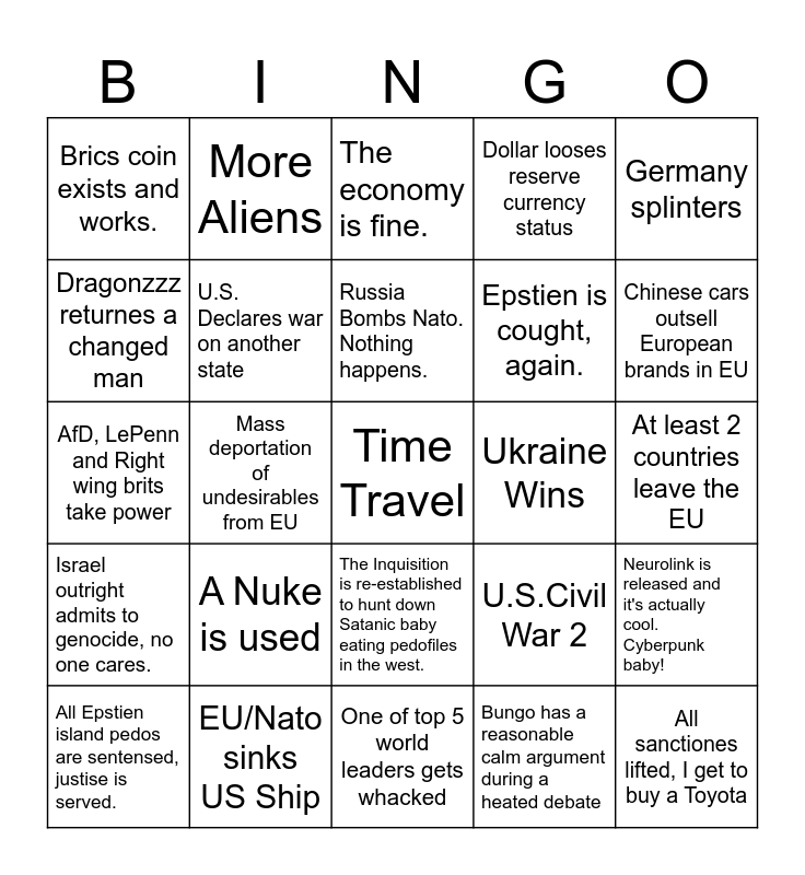 This bingo card has 25 words: A Nuke is used, One of top 5 world leaders gets whacked, Russia Bombs Nato. Nothing happens., All Epstien island pedos are sentensed, justise is served., Germany splinters, Brics coin exists and works., Dragonzzz returnes a changed man, More Aliens, Ukraine Wins, The Inquisition is re-established to hunt down Satanic baby eating pedofiles in the west., Epstien is cought, again., AfD, LePenn and Right wing brits take power, U.S.Civil War 2, Neurolink is released and it's actually cool. Cyberpunk baby!, U.S. Declares war on another state, All sanctiones lifted, I get to buy a Toyota, At least 2 countries leave the EU, The economy is fine., Chinese cars outsell European brands in EU, Mass deportation of undesirables from EU, Time Travel, EU/Nato sinks US Ship, Israel outright admits to genocide, no one cares., Dollar looses reserve currency status and Bungo has a reasonable calm argument during a heated debate.
